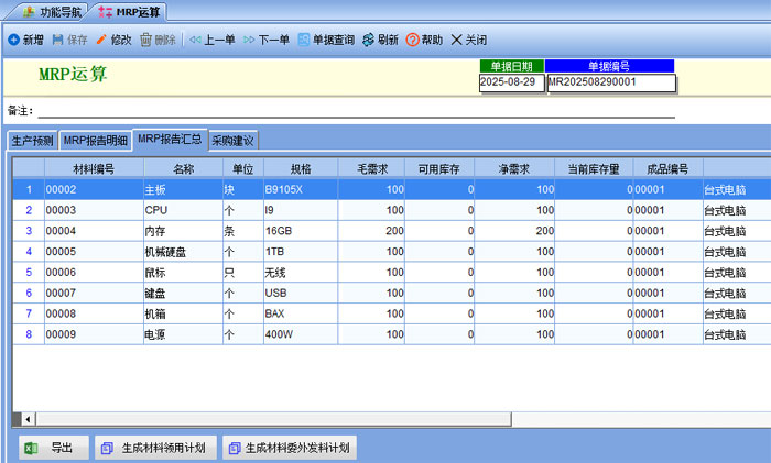 標(biāo)準(zhǔn)版主要功能為采購(gòu)訂單,采購(gòu)入庫(kù),生產(chǎn)計(jì)劃,MRP運(yùn)算,材料領(lǐng)用,生產(chǎn)入庫(kù),銷售出庫(kù),應(yīng)收應(yīng)付賬款管理